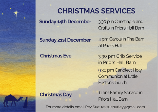 During the major refurbishment of St Mary’s church, our services are currently being held at Priors Hall Barn, opposite the church car park. Please wrap up warm.